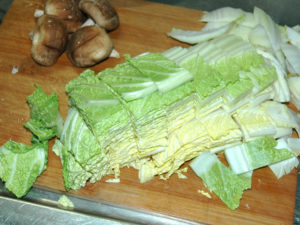 ![]() 3:白菜はざく切りにし、椎茸は石づきを取ります。 |