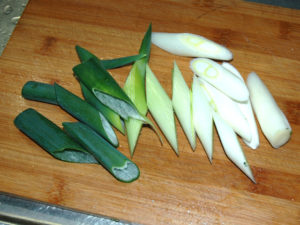 ![]() 5:長ネギは、斜め切りにし、春菊は食べやすい長さに切ります。 |