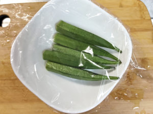 ![]() 2:ヘタを取ったオクラを耐熱容器に乗せ、ラップをして、レンジで1分半ほど加熱し、すぐに冷水にとり、冷ましておきましょう。 |
