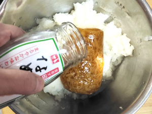 ![]() 5:大根おろしとなめたけ、めんつゆをボールに加えて混ぜ合わせます。 |