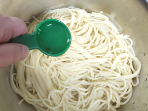 パスタには油を絡めておかないと、麺同士がくっつくので、忘れないようにしてください。^^