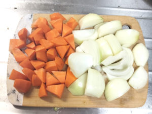 ![]() 3:玉ねぎは皮をむいて厚めのくし形切りにし、人参は皮をむいて小さ目の乱切りにします。 |