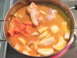 ![]() 5:鍋に、バターチキンカレー鍋用スープを入れ、手羽元と人参、玉ねぎを入れて、一旦煮立たせます。 |