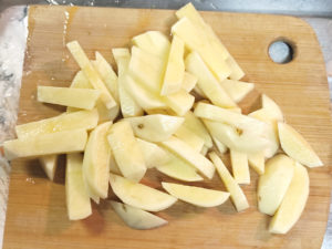 ![]() 7:煮ている間に、じゃがいもの皮をむき、スティック状に切っておきます。 |