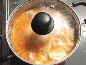 ![]() 6:煮立ったら、弱火にしてから蓋をし、15分ほど煮ましょう。 |