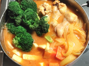 ![]() 4:今回は、モランボンから売られている「バターチキンカレー鍋用スープ」を利用しました。 |