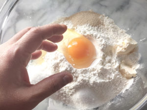 ![]() 1:ボールに、強力粉、卵、イースト、塩(イーストの反対側に)、上白糖、マーガリンを加えて、手で崩しながら混ぜます。 |