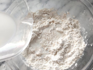 ![]() 2:最初に牛乳を1/2量入れ、混ぜながら、少しずつ牛乳を足し、生地が軽く手にくっつくくらいまでの柔らかさまでまとめましょう。 |