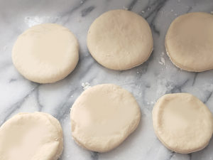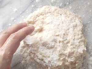 ![]() 7:生地に薄力粉を少量(分量外)まぶし、生地をめん棒で2.5cmほどの厚さに伸ばしたら、9cmの丸型でくり抜きます。 (上から垂直に押し、型をひねって回します。) |