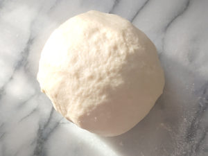 ![]() 3:台に強力粉を多め(分量外)に振り、生地を台に乗せたら、上にも強力粉を多めに振って、生地が滑らかになるまで10分程度捏ねます。 (打ち粉は多めにすると捏ねやすいです。) |