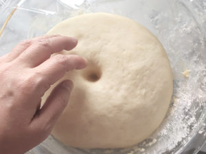 ![]() 6:生地を指で押してみて、跡が戻らないようなら発酵完了。 |