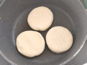 ![]() 9:テフロン加工のフライパンを弱火で熱し、手をかざして熱くなったら、弱火で片面5分ずつ焼きましょう。 (焦げないように弱火で焼いてください。) |