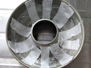 ![]() 1:ケーキ型にマーガリン(分量外)を塗り、同心円を描くようにして帯状にクッキングシートを貼り付けます。 (形状が複雑なケーキ型なので、くっつきやすい部分にシートを貼り付けます。) |