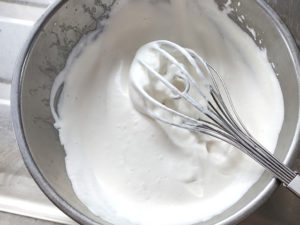 ![]() 13:別のボールにホイップ用生クリームとクリーム用の砂糖を入れ、8分立てくらいのやや固めのクリームを作ります。 |