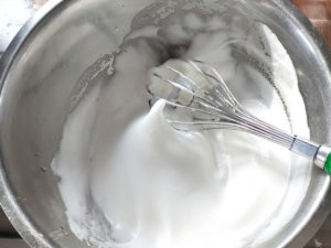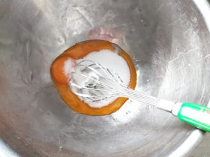![]() 4:卵黄のボールに卵黄用の砂糖を全量入れ、白っぽくもったりするまで泡立てましょう。 |
