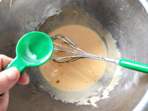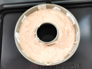 ![]() 9:ケーキ生地を型に流し入れ、上からトントン落として大きな気泡を取り除きます。 |