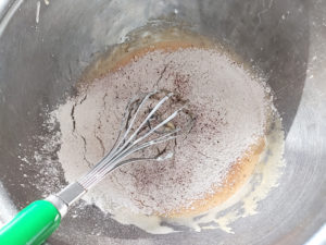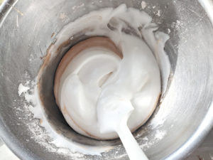 ![]() 7:卵黄のボールに薄力粉とココアパウダーを一緒にふるい入れ、粉っぽさが無くなるまで混ぜましょう。 |