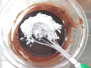 ![]() 3:ボールにチョコが温かいうちにグラニュー糖を加え、ザラザラ感がなくなるまで混ぜます。 |