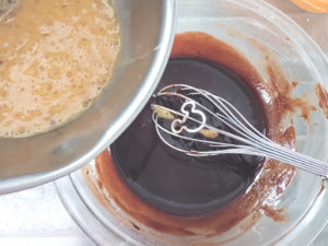 ![]() 4:卵を溶いたものを数回に分けて加え、その都度よく混ぜましょう。 (一気に加えると分離します。) |