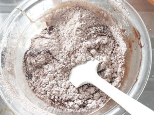 ![]() 6:薄力粉、ベーキングパウダー、ココアを一緒にボールにふるい入れ、ゴムベラで練らないようにさっくりと混ぜましょう。 |