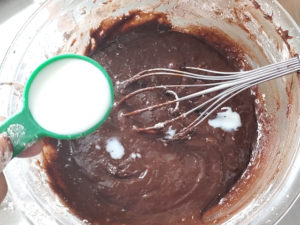 ![]() 7:牛乳もボールに加え、全体になじむ程度に混ぜたら、生地はOKです。 |