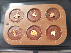 ![]() 9:シリコン型に薄く油を塗ったら、生地を8分目くらいまですくい入れます。 110:中央にクルミを散らして、準備は完了。 |
