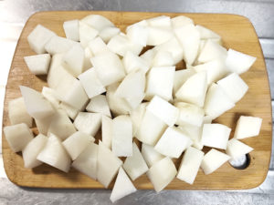 ![]() 1:大根は皮をむいて、小さめの乱切りにします。 |