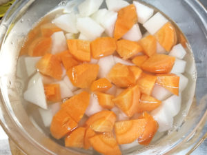 大根と人参は、しっかりと火を通さないと硬いので、多めにレンジで加熱してください。