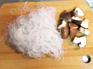 ![]() 6:白滝は食べやすい長さに切り、椎茸は軸を取って小さめに切りましょう。 |