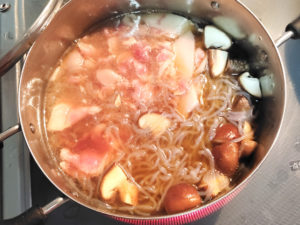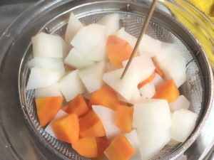 ![]() 8:大根と人参に火が通ったら(竹串がすっと通るくらいまで)、お湯を切り、鍋に加えましょう。 |