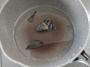 ![]() 2:フライパンに鰹節を加え、中火で煮立たせ、煮立ったら1分ほど煮てから、鰹節と昆布を取り除きましょう。 |
