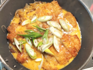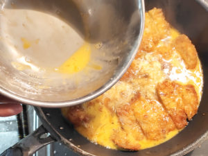 ![]() 10:玉ねぎが入ったフライパンに、カットしたトンカツを並べ入れ、具材用の卵を溶いたものを回しかけます。 |