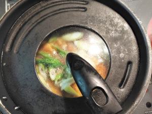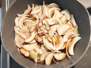 ![]() 5:調味料が煮立ったら、玉ねぎと椎茸を加えて、弱火で煮込み、玉ねぎが半透明になればOKです。 |