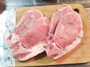 ![]() 6:豚肉は、身と脂身の間に垂直に切り込みを入れます。 (筋きりすると、揚げても縮みにくくなります。) |