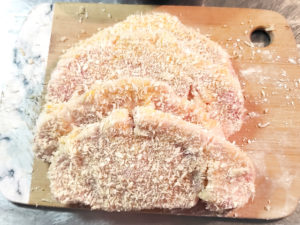 ![]() 7:豚肉に、薄力粉→衣用卵を溶いたもの→パン粉の順に衣をつけましょう。 |