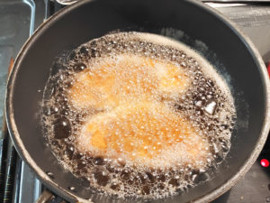 ![]() 8:180度~190度の油で、表面がきつね色になるまで揚げます。 (裏表で、3~4分ずつくらいが目安です。) 9:揚げ終えたら、食べやすい大きさにカットしておきましょう。 |