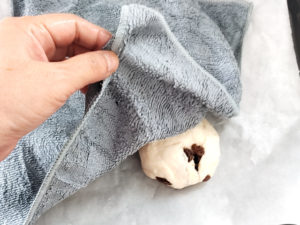 ![]() 11:布巾の上にラップをかぶせ、40度のオーブンで40分ほど二次発酵させましょう。 |