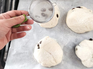 ![]() 12:生地に茶こしなどで、仕上げ用の強力粉をふりかけましょう。 |