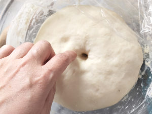 ![]() 5:生地が3倍くらいに膨らみ、指の跡が戻らないようなら発酵完了です。 6:拳で2から3回、パンチをするようにして、ガス抜きをします。 |