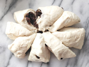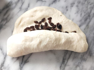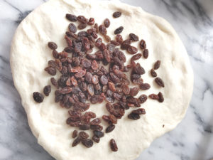 ![]() 7:生地を台の上に広げ、レーズンを軽く押し込むようにして広げましょう。 |
