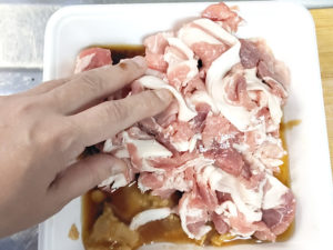 ![]() 1:豚こまは食べやすい長さに切り、砂糖、味噌、オイスターソース、醤油を混ぜ込み、そのまま使うまで置いておきます。 |