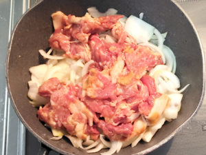 ![]() 3:肉を漬けこんでから5分ほど経ったら、テフロン加工のフライパンに、油を引かずに、玉ねぎと豚肉を炒め始めます。 |