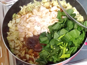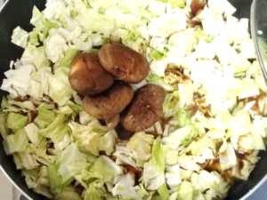 ![]() ⑨鍋にキャベツと椎茸を加え、蓋をして、5分程煮こみます。 |