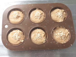 ![]() 9:型に等分になるように生地をスプーンなどですくい入れ、上にキャラメルクランチを散らしましょう。 |