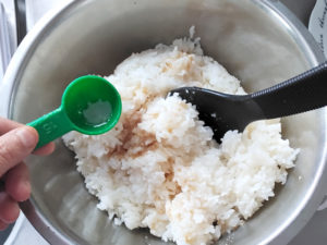 ![]() 1:大きなボールなどに、白飯と焼き肉のたれを混ぜ合わせて、味付きのご飯を作っておきます。 |