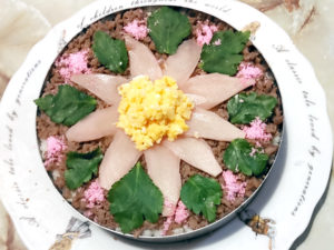 ![]() 11:肉そぼろを配置したら、中央に生姜の甘酢漬けで花びらのように配置し、中央のスペースに卵そぼろ、花びらの外側には、三つ葉や桜でんぶを配置すればOK。 |