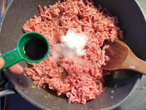 ![]() 5:フライパンにひき肉と挽肉用の砂糖と醤油を加えて火にかけ、木べらでぽろぽろになるように崩しながら炒めます。 |