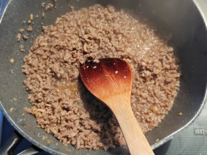 ![]() 6:火にかけて混ぜながら、水分がほぼ飛べば、肉そぼろはOK。 |