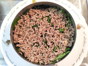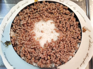 ![]() 10:セルクルのご飯の上に、残りの肉そぼろを、中央を空けて敷き詰めましょう。 |