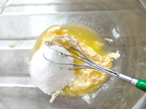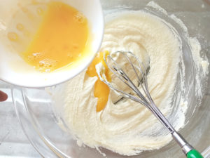 ![]() 3:溶いた卵を少しずつ注ぎ入れ、その都度よく混ぜます。 (一気に加えると分離します。) |